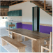 El planteamiento arquitectónico contempla una escalera en estructura metálica y peldaños en madera y carpintería en madera de roble, acabado en color verde turquesa y muros allanados con zócalo color uva, identidad de la vivienda.