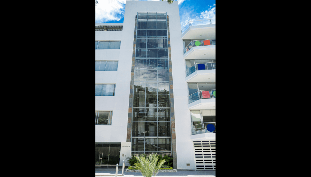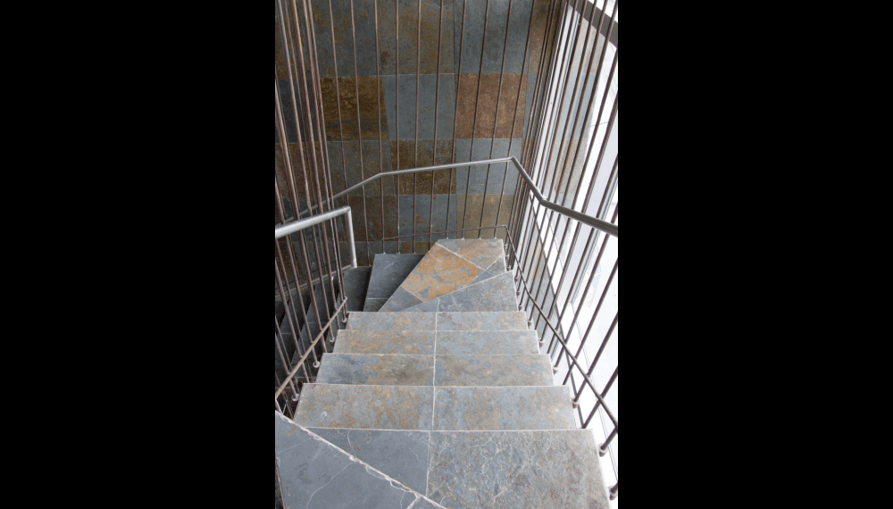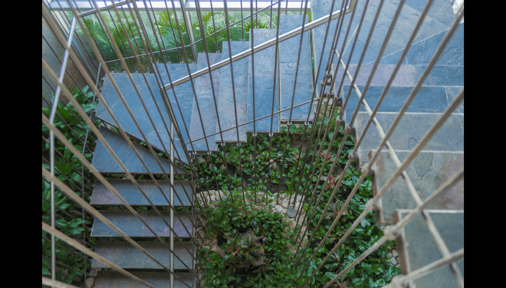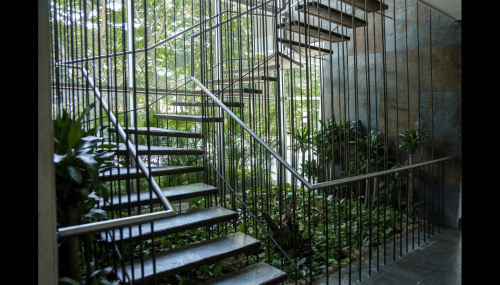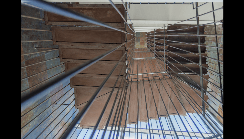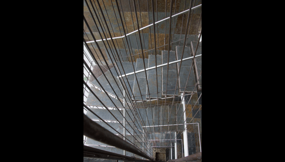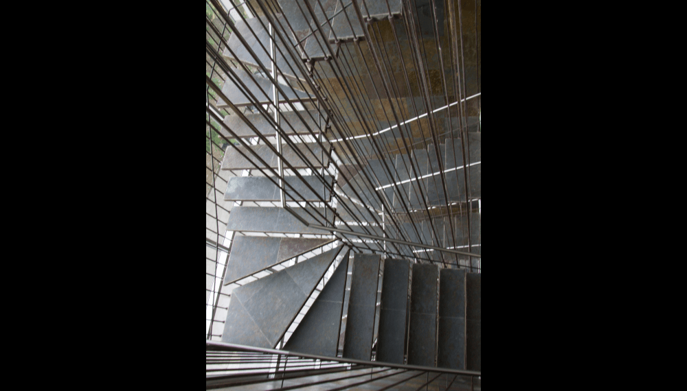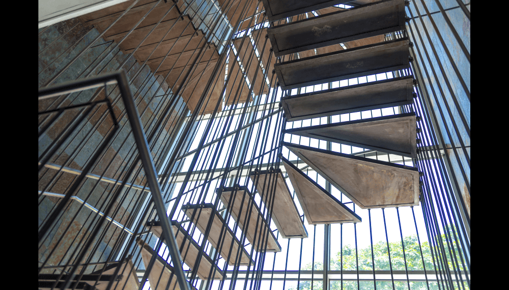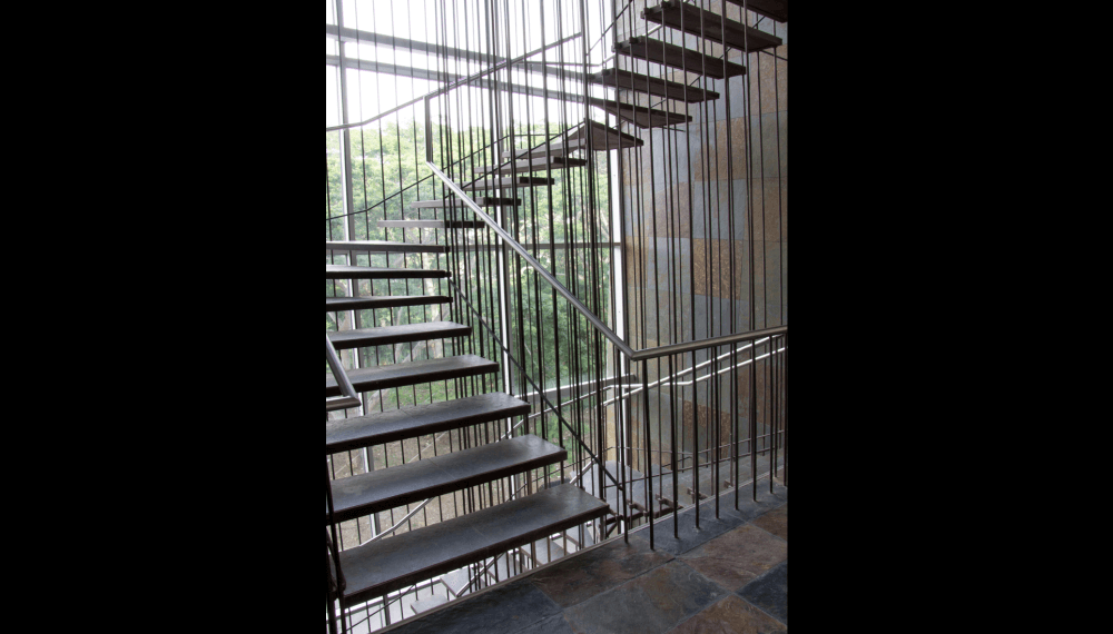 Su escalera en estructura metálica, colgada de tensores de acero y peldaños independientes, que da a la fachada principal, enmarcada en una caja de vidrio inclinada, da al edificio su mayor valor agregado, porque permite traer la fauna y la flora al edificio y recíprocamente logra trasladar el edificio a ellas.