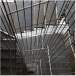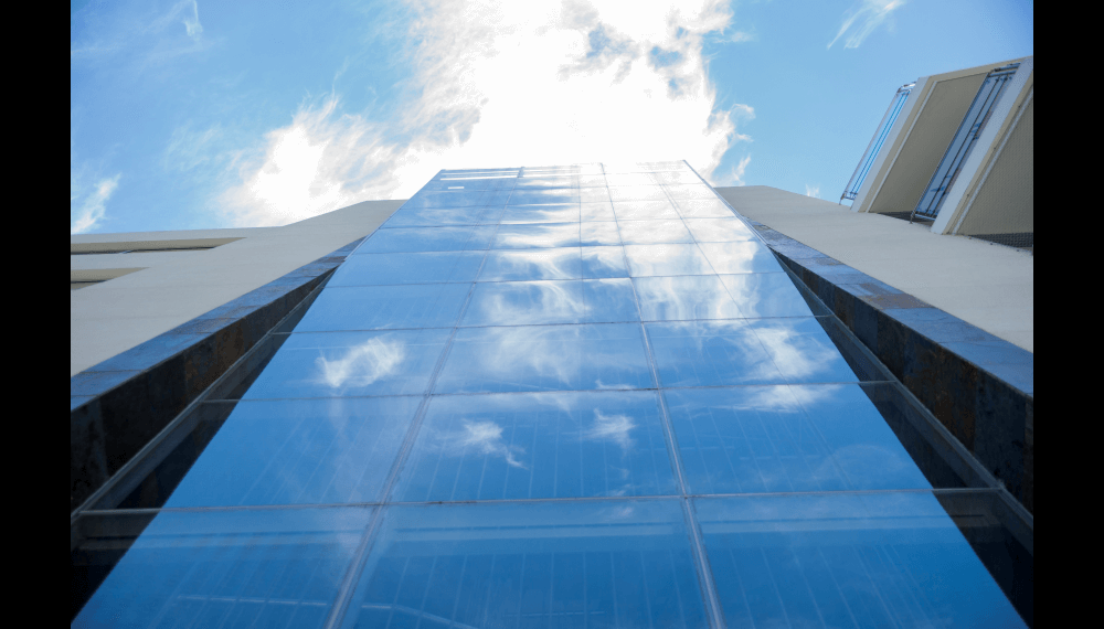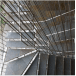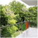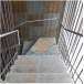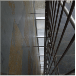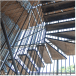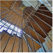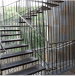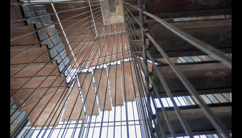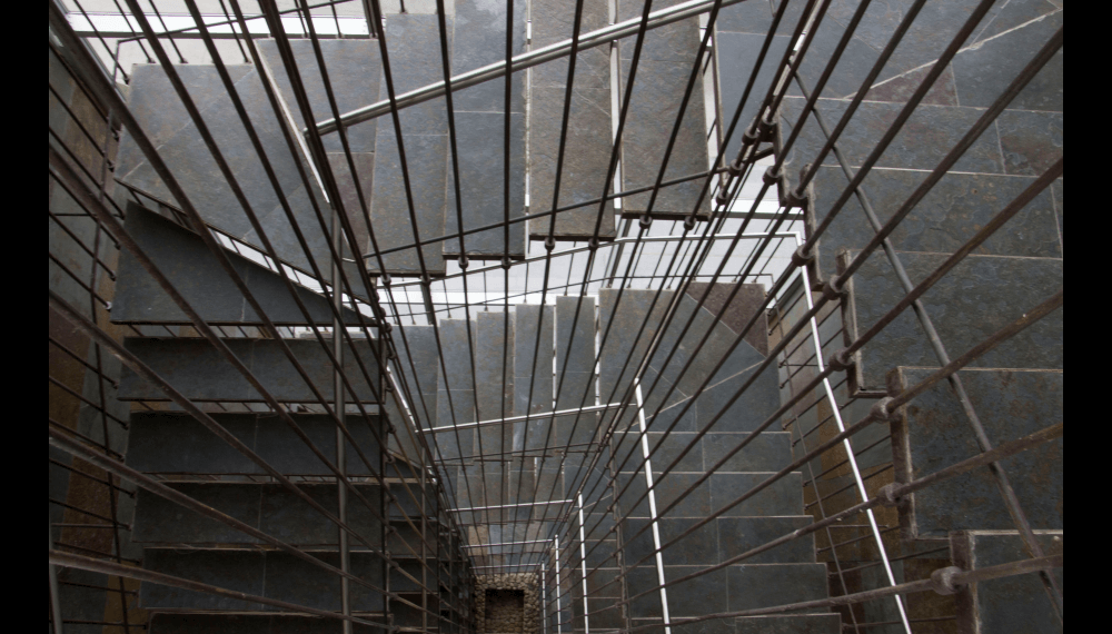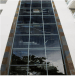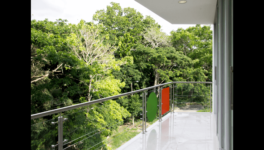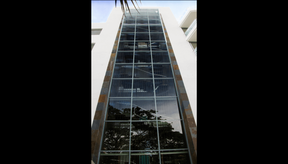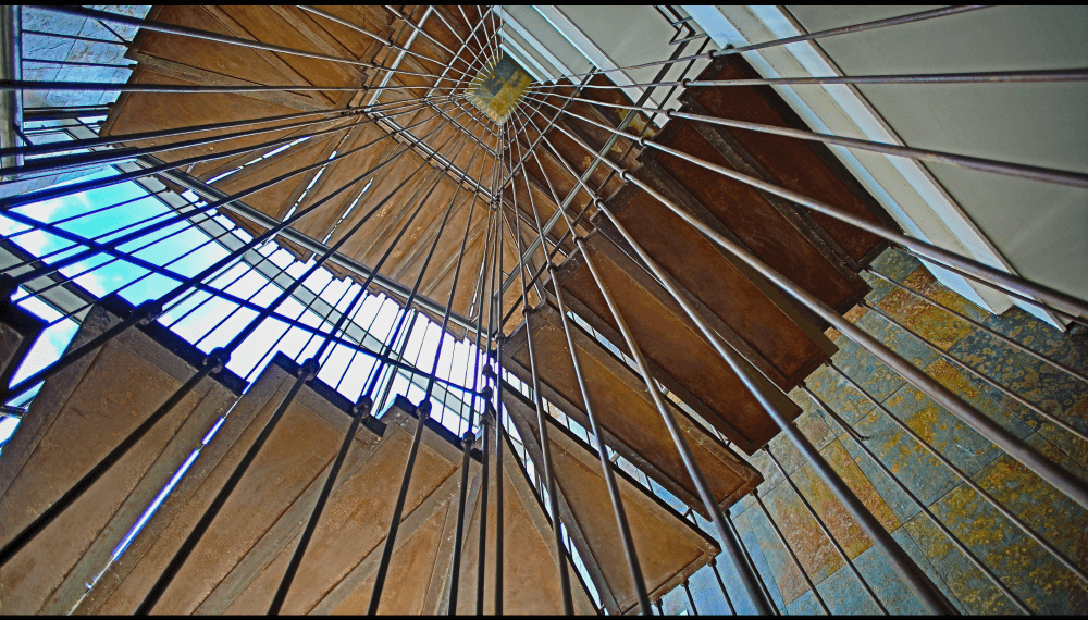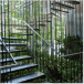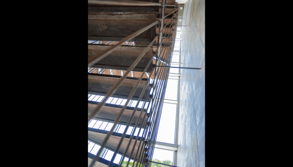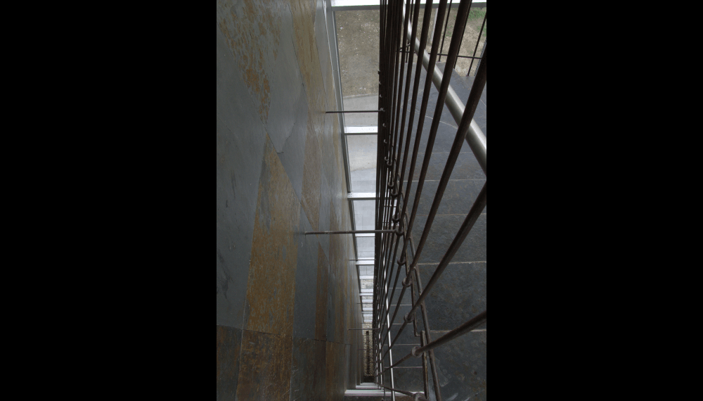 Su escalera en estructura metálica, colgada de tensores de acero y peldaños independientes, que da a la fachada principal, enmarcada en una caja de vidrio inclinada, da al edificio su mayor valor agregado, porque permite traer la fauna y la flora al edificio y recíprocamente logra trasladar el edificio a ellas.